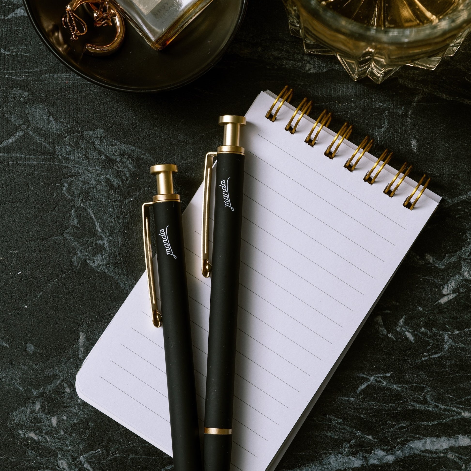 Designed with a sleek all-black body and finished with polished gold accents, the Audrey Pen brings understated luxury to your everyday writing. Housed in a matching black box, it’s as beautiful to gift as it is to use.